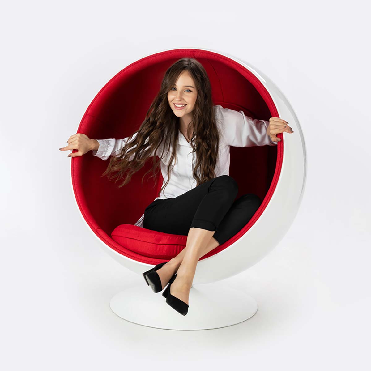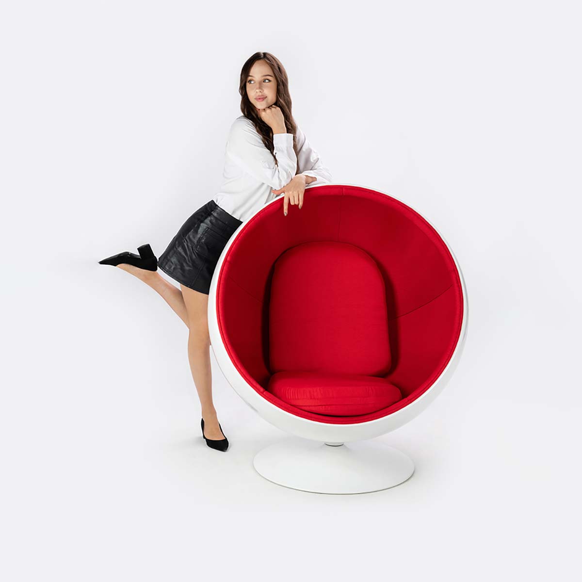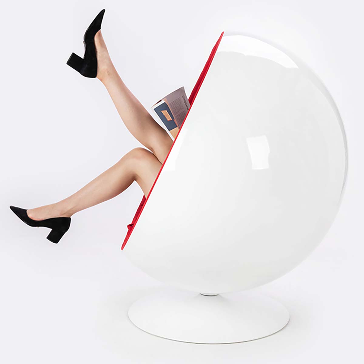 Our armchair is a proposal for lovers of design and luxury furniture. It was designed with the utmost care for every detail. Its simple, yet modern form will delight everyone. The white ball-shaped body is made of fiberglass, which is extremely durable. The interior of the armchair is upholstered in red fabric. This contrasting, yet classic combination of colors will fit into modern, imaginative interiors. The glossy finish of the body adds extra character.